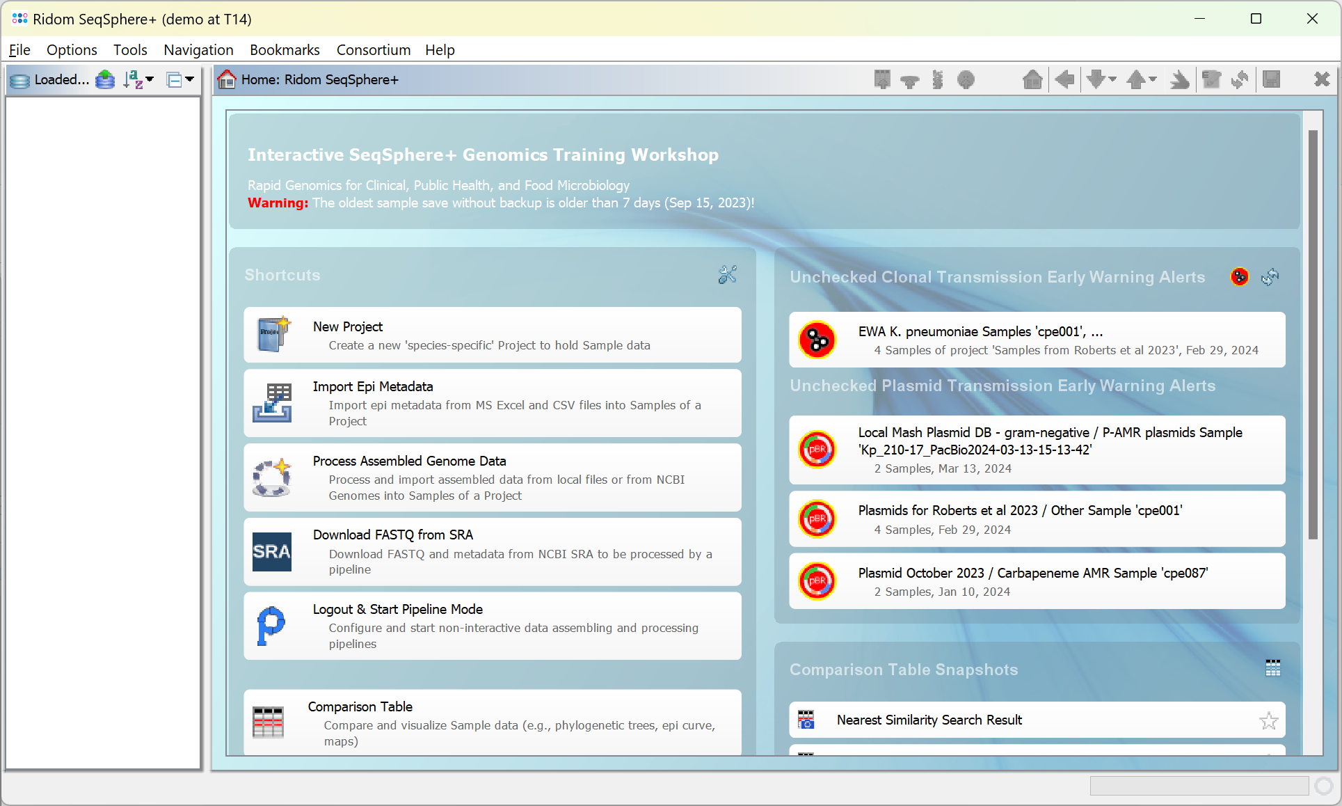 The three most recent and unchecked clonal and plasmid EWAs that were triggered are shown on the top of the home screen in the section Unchecked Early Warning Alerts. If an EWA is opened by clicking on it, a plasmid table with the involved plasmids or a comparison table with the involved samples is shown.