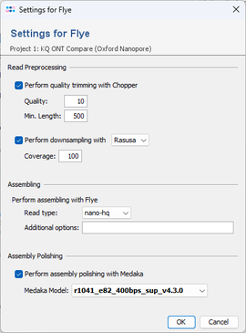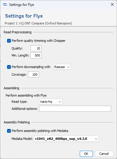 By default, the reads are trimmed with Chopper (quality 10, min length 500) and downsampled with Rasusa to 100x estimated coverage. The Flye assembler is by default started with option After assembling, medaka is used by default to polish the assembly. When confirming the project settings of the pipeline script, the assembler options dialog opens up and the newest available medaka model for dorado super accuracy basecalling (SUP) is preselected. Press OK to confirm these settings. |