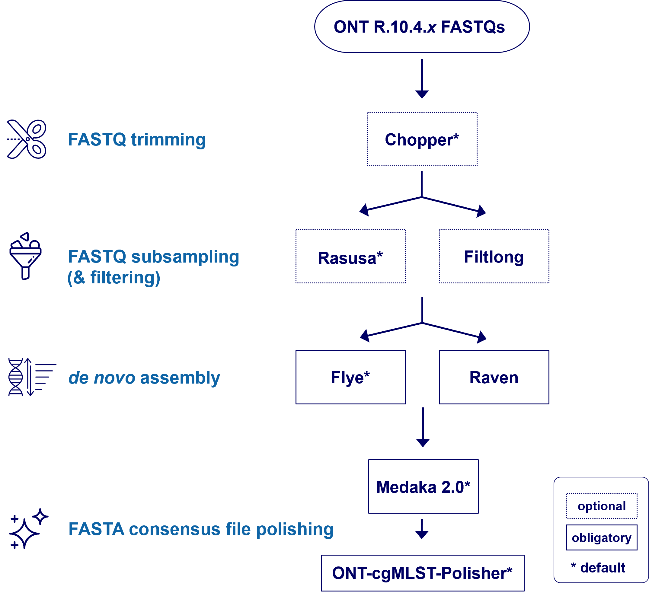 The sub-module enables users to assemble Oxford Nanopore Technologies (ONT) FASTQ-files. The sub-module requires at least 32 GB RAM. It can also directly monitor and process MinKNOW run data. The sub-module consists of the following tools: