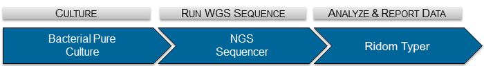 Ridom TyperMicrobial Genomics Software for any Bacteria, any Research Topic, any LabMBioSEQ Ridom Typer Software is designed for distributed work-groups (client/server model) and allows automatic processing and analyzing of NGS (e.g., Illumina, Oxford Nanopore, Ion Torrent, or PacBio) and Sanger capillary- electrophoresis (CE) sequence data. Ridom Typer is the single solution for easy and automated microbial analysis; enabling your lab to employ whole genome microbial typing (cgMLST) or traditional MLST sequencing projects. Elevate your Microbial Research to the next LevelA variety of methods have been developed to generate isolate-specific fingerprints for epidemiological typing. However, until now there is no single typing method available to address different bacterial population structures (monomorphic vs. panmictic) and all study types (e.g., evolutionary/phylogenetic, population genetics or transmission chain/outbreak). For decades, the common typing method is based on multi locus sequence typing (MLST) of 5-7 housekeeping genes or pulse field gel electrophoresis (PFGE) and multi locus VNTR analysis (MLVA). Although widely adopted, these methods either lack discriminatory power or are labor intensive and difficult to standardize. Now, microbiologists everywhere can experience the genomic revolution that benchtop next generation sequencing (NGS) provides. With fast affordable microbial whole genome shotgun (WGS) next generation sequencing and automatized software analysis, microbiologists can use genome-wide hundreds/thousands of genes (cgMLST) for typing, resulting in extremely high discriminatory power. Such a power coupled with rapid and simple NGS workflows (Figure), makes this complete solution ideal for everyday microbial monitoring to studies. That is, one disruptive technology that fits any bacteria, any study type and any laboratory. Ridom Typer WGS Workflow |