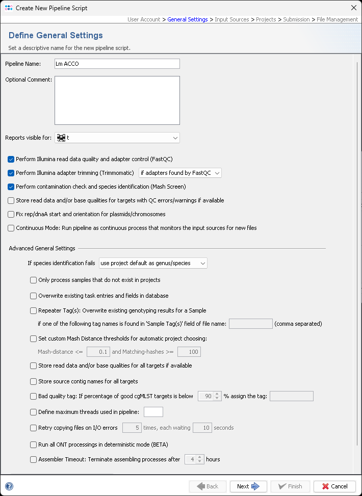 If the checkbox Automatically choose project (Mash Distance) is selected, the pipeline uses Mash Distance to choose the project for a Sample out of the list of projects defined in the pipeline script. Therefore, only one project per species can be defined in the pipeline if this option is used. The option is disabled if project acronyms are used.