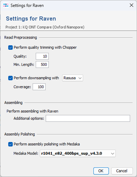 By default, the reads are trimmed with Chopper (quality 10, min length 500) and downsampled with Rasusa to 100x estimated coverage. After assembling, medaka is used by default to polish the assembly. When confirming the project settings of the pipeline script, the assembler options dialog opens up and the newest available medaka model for dorado super accuracy basecalling (SUP) is preselected. Press OK to confirm these settings. |