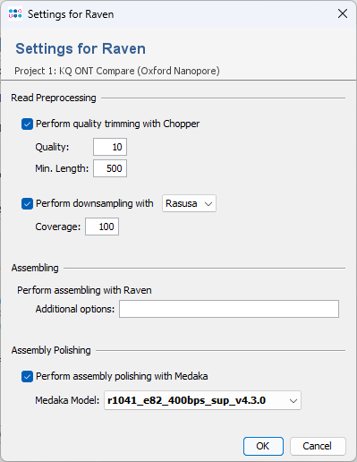 Please Note: requires the Long Read Module (LRM) OverviewRaven (citation) is a de novo assembler for long read data (e.g., Oxford Nanopore). It can be used in the assembling pipeline if the Ridom Typer client is running on Linux or if the Windows Subsystem for Linux is installed on Windows. It is only available with the ONT Data Assembly Module. See the page assembler evaluation for a detailed comparison of the performance. Raven Assembling OptionsThe assembler options dialog in the pipeline script allows to specify the pre- and postprocessing, and to set additional Raven parameters.