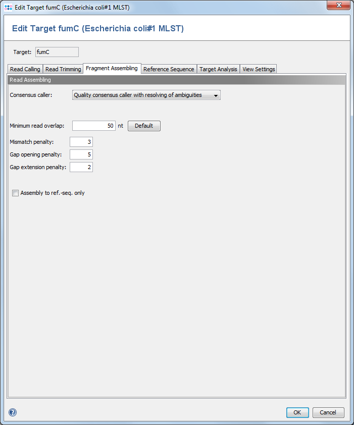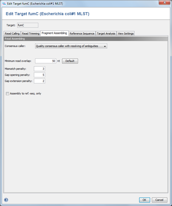 This dialogs defines the consensus calling and assembling functions. 4.1 Consensus callerThe consensus caller for the contigs of an assembly can be chosen here. Currently there are five different consensus callers available. 4.1.1 Quality Consensus Caller Without Resolving of AmbiguitiesThis algorithm calculates the consensus base for a sequence column with Bayes formula. The quality of the read bases and the read orientation are used in this calculation. In a first step separate quality values for forward and reverse directions are calculated with Bayes formula. In a second step Bayes formula is used again to calculate a combined consensus quality value. Ambiguity bases are counted as separate base types and are not resolved. Each gap is given the quality of 20, and if the quality sum of the gaps exceeds the quality sum of all base calls, the consensus will have a gap at this position. This consensus calling method should be used for input sequences with possible heterozygous positions (determined by a heterozygot caller) and with quality values related to an error probability by the formula <math> quality = -10 * \log_{10} (error-probability) </math> 4.1.2 Quality Consensus Caller With Resolving of AmbiguitiesThis algorithm is very similar to the first one (Quality Consensus Caller Without Resolving of Ambiguities). The only difference is the treatment of ambiguities: ambiguous bases are resolved here, for example a S counts as C and G. This consensus calling method should be used for input sequences (usually with a heterozygot caller turned off) with quality values related to an error probability by the formula <math> quality = -10 * \log_{10} (error-probability) </math> 4.1.3 Majority Consensus CallerThis algorithm gives each base the same weight. The consensus base is determined by the majority base type of a column. Ambiguities cast a vote for each possible base call they represent, for example an S counts for C and G. If there is no unique majority base, an ambiguity including all bases will be called. If there are 66% or more gaps at one column position, the consensus will have a gap at this position. This consensus calling method should be used for input sequences without quality values 4.1.4 Strict Consensus CallerThis algorithm performs a consensus calling allowing only a very limited number of mismatches. In general the algorithm performs a majority consensus call. However, all consensus columns with a coverage of only one read get a N consensus base. The table below shows the maximum allowed number of mismatches in a column for a given coverage. More mismatches will lead to a N call. All ambiguous base calls are treated as N. If there are 66% or more gaps at one column position, the consensus will have a gap at this position. This consensus calling method should be used for forensic DNA typing 4.1.5 Inclusive Consensus CallerThis algorithm includes every base type in a column. The consensus base is the smallest ambiguity base covering all read bases. If there are 66% or more gaps at one column position, the consensus will have a gap at this position. 4.2 Minimum read overlapThis parameter can be used to configure the minimum overlap that two reads must share, before they are aligned together. Under normal circumstances the default value of 50 works fine. 4.3 Mismatch / Gap Opening / Gap Extension PenaltiesThe penalty values for the assembling algorithm. The defaults are 3 / 5 / 2. 4.4 Assemble to ref.-seq. onlyInstead of aligning all reads to each other in an assembling process, the reference sequence only can be used for guiding the building of an assembly (this will speed up the process).