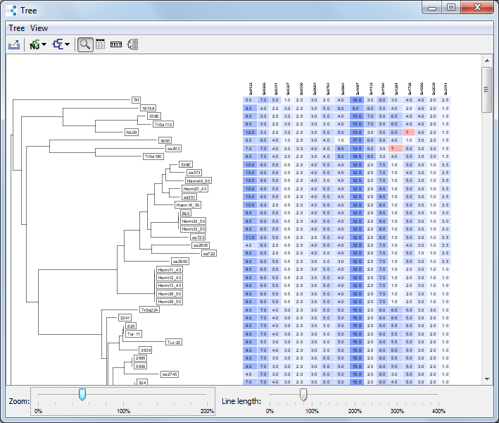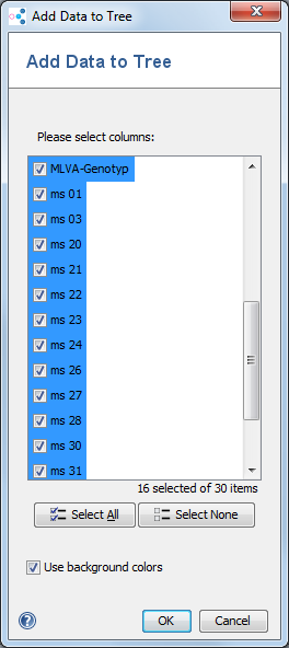 This function allows to add values from the table to the tree. It is only available when trees are displayed as dendrogram. If no data is displayed when this function is called the columns that are used for distance calculation are pre-selected in the list. If data is already displayed, the displayed columns are preselected. The Use background colors box chooses if the additional data should use the background colors from the comparison table. Note that the displayed data is removed when the tree is disconnected from table. |