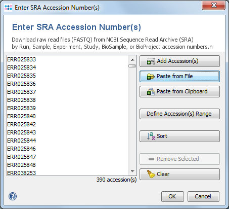 Invoke the function Tools | Download FASTQ from SRA to open a dialog window and enter or import the NCBI accessions that should be downloaded. The following types of accessions are supported (NCBI, EMBL-EBI, DDBJ):