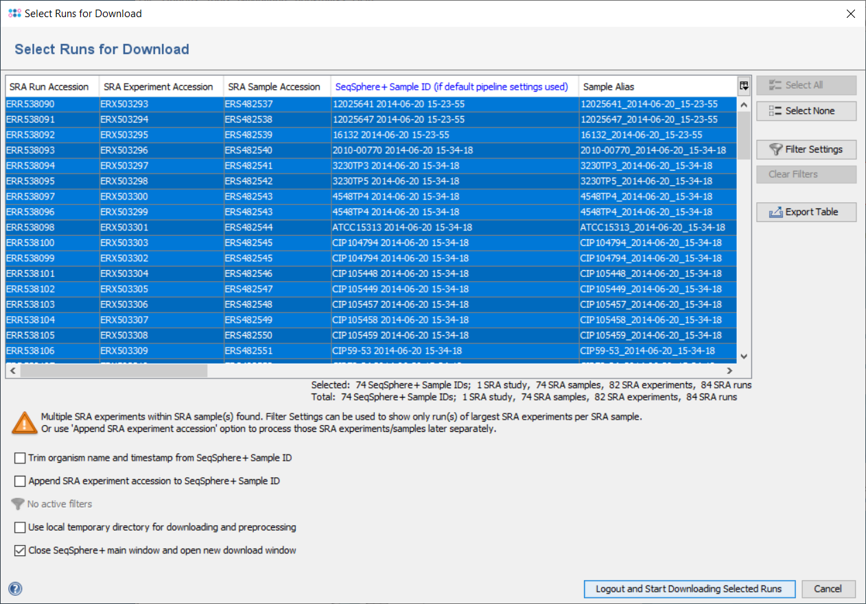 The Ridom Typer Sample ID determines how the downloaded reads are treated. If there are potential problems with the Sample ID, context-sensitive warnings are shown below the table in the left corner of the window. Downloading FASTQs and metadata with default settings would result in assembling multiple SRA runs of the same SRA experiment together once a pipeline with default file naming parameters would be started. However, also multiple SRA experiments of the same SRA sample would be assembled together. To avoid this latter case either use the 'Append SRA experiment accession to Ridom Typer Sample ID' checkbox option to assemble the experiments separately or apply the 'SRA experiments' filter. Similar, if there would be SRA samples with the same Strain Name also those reads would assemble wrongly together. In this case either use the the 'Append SRA experiment accession to Ridom Typer Sample ID' checkbox option to assemble the SRA samples separately or apply the 'SRA samples' filter. Finally, in the unlikely case that two SRA samples have no Strain Name but the same Sample Alias, a warning 'Different SRA samples with the same Ridom Typer Sample ID were found!' would be shown. Again the issue could be solved by using the 'Append SRA experiment accession to Ridom Typer Sample ID' checkbox option to assemble the SRA samples separately.