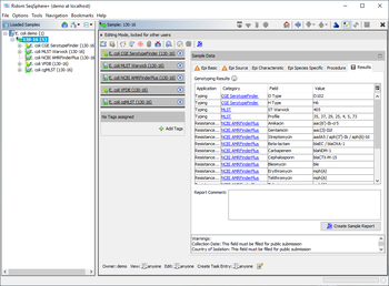 Only the two fields 'O Type' and 'H Type' are shown in the result tab of the Sample Overview. However, by clicking the CGE SerotypeFinder category links all details for this sample can be viewed. All 29 result fields can be exported and selected from the CGE SerotypeFinder entry for searching under 'Field Criteria' in the advanced mode of the sample search dialog. Only the two fields 'O Type' and 'H Type' are shown by default in a comparison table (with gray column header) when the task template was chosen. However, if needed the other 27 gene specific result fields can be added to a comparison table using the advanced settings. |