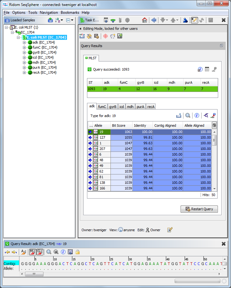 DNA re-sequencing editorWGS data: Assemble data using the integrated de-novo Assembler Velvet or Spades, or the BWA reference mapper. Edit and analyze assembled DNA sequences (e.g., for MLST or cgMLST typing). Auto-correction of homopolymer related InDel errors (Ion PGM & 454 GS Junior). Sanger data: Assemble, edit and analyze Sanger CE sequencing data (e.g., for 16S rDNA or MLST typing). Chromatograms can be automatically assembled into contigs using configurable file naming conventions. DatabaseStore, search, retrieve, export and create reports from your circumstantial information (e.g., place and time) and DNA sequence data stored in an integrated SQL database. Search new sequence entries against stored data. Data fields are compliant with the metadata requirements of the NCBI BioSample. Data entry plausibility checks are possible. Bacterial genotypingTyping of bacteria is automatically performed. Ridom Typer includes support for the following genotyping methods: MLST: Fetch allele numbers for sequences and STs from the PubMLST server or define a local MLST typing, e.g. for using new targets. cgMLST: Extension of MLST that uses thousands of targets, for a gene-by-gene allele typing of NGS data. Resistance, virulence, and serotyping: Genotypic resistance prediction by usage of the NCBI AMRFinderPlus, virulence typing via VFDB (that supports 54 species of medical importance), and Listeria monocytogenes and Escherichia coli serotyping. Automatic NCBI GenBank online queries: Compare the DNA sequences with best matches from GenBank. Single locus queries: Do single locus typing (SLST) and compare against libraries stored in the local database. Quality checkingQuality of DNA data can be automatically checked with user defined target QC parameters (e.g., coverage, intragenic stop codons, frame shifts detection). Analytical toolsSelect data entries from a comparison table for epidemiologic studies, evolutionary or functional analysis. Cluster and visualize data entries by using minimum spanning or UPGMA/Neighbor Joining trees. SecurityEncryption (SSL) of data in transmission. Various configurable user roles, user groups and access controls. Audit trail functionality (who, when and what). CommunityOption to contribute to a single world-wide expanding publically available database of nomenclature and epidemiologic data. Own server for epidemiologic data for larger (supra) national institutions on request. Rapidly and easily share task templates with other institutions or download them online from the Task Template Sphere. |