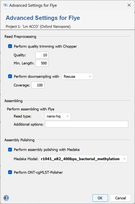 By default, the reads are trimmed with Chopper (quality 10, min length 500) and downsampled with Rasusa to 100x estimated coverage. To read types are selectable in the settings dialog After assembling, medaka and ONT-cgMLST-Polisher are used by default to polish the assembly. |