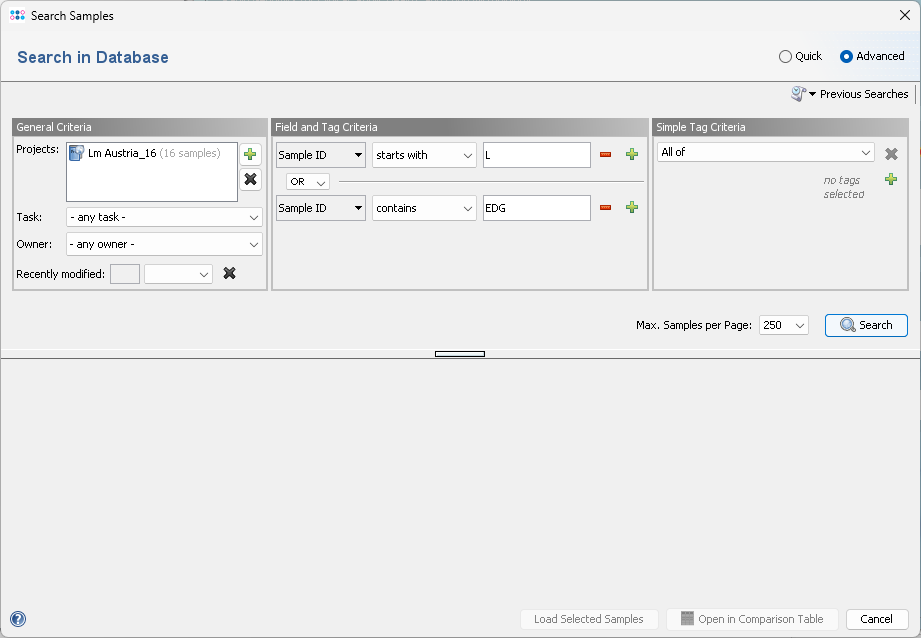 - The Simple Tag Criteria area allows to limit the search to samples that have or don't have a specific tags assigned.