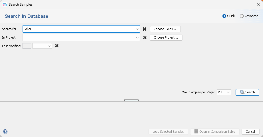 Search Sample allows to search the sample database on the Ridom Typer server. It opens a dialog window that can be switched from Quick to Advanced mode with the buttons at the upper right side of the window.