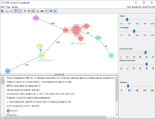 All Samples in a node can be selected by clicking a node and the tree nodes can be dragged with the mouse. The context menu can be opened by clicking a node with the right mouse button. Due to the used algorithm lines may intersect with nodes or other lines. This can be corrected manually by dragging the tree nodes to rearrange them. The automatic graph relaxing (button MSTRelaxer.png) can apply the force-based algorithm to update the layout continuously when nodes are moved. The context menu of node can be used to lock the node to the current position.