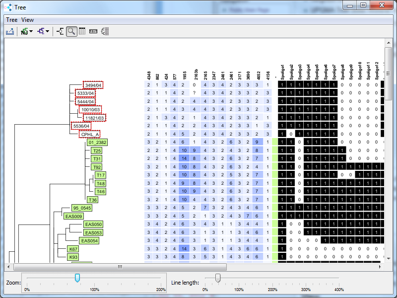 Screenshot of the Phylogenetic Tree Window. Selected Samples are highlighted by a red dotted outline. Table data is included in the tree image.