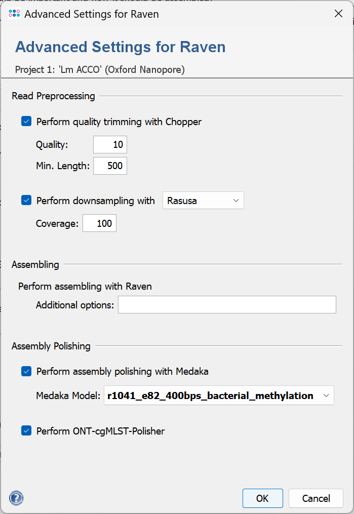 OverviewRaven (citation) is a de novo assembler for long read data (e.g., Oxford Nanopore). It can be used in the assembling pipeline if the Ridom Typer client is running on Linux or if the Windows Subsystem for Linux is installed on Windows. See the page assembler evaluation for a detailed comparison of the performance. Raven Assembling OptionsThe assembler options dialog in the pipeline script allows to specify the pre- and postprocessing, and to set additional Raven parameters.