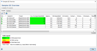 Once the Sample QC Overview window is open the table in the first tab shows the important QC related procedure statistics fields. The columns of the QC fields are highlighted according to the QC result: green (QC ok), yellow (QC warning), or red (QC failed). The first column shows a summary of all evaluated QC fields. This column contains for each result of those fields an icon showing the specific QC result. The samples are by default sorted by this first column with the sample that has the worst QC result at the top. By clicking on column headings the samples can be sorted by other column results. If sequencing run details were imported for samples, their Run ID is also shown in the table and can be clicked to show the run details in complete. Similar statistics except the first column are shown also in the Pipeline Report and Sequencing Run Details.