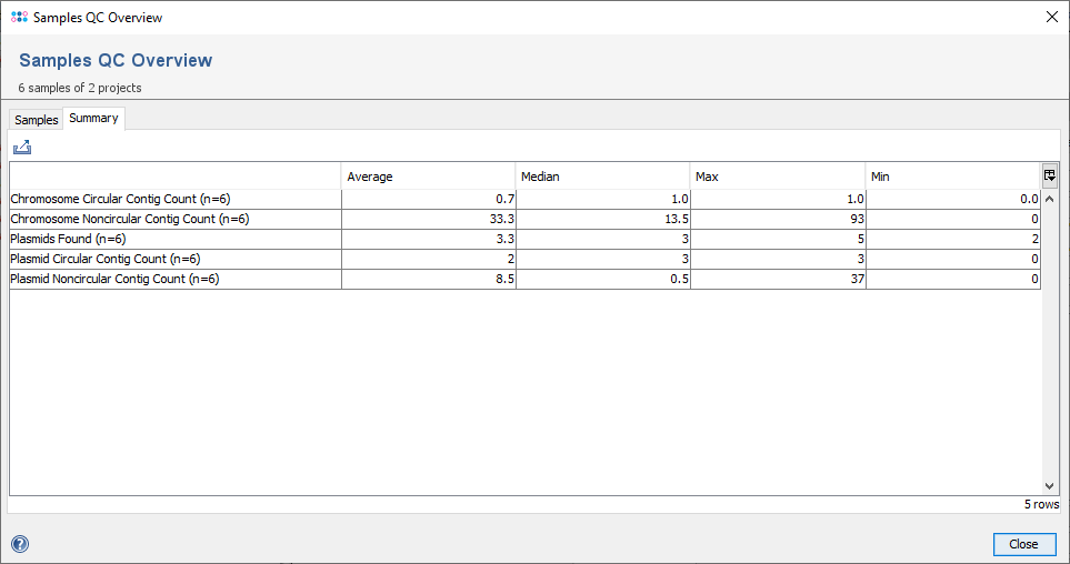 The second tab shows a summary statistic for some fields of the Chromosome and Plasmids Overview Task Template.