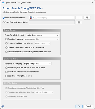 - Export for selected samples contig files and SPEC files / only contig files / SPEC files