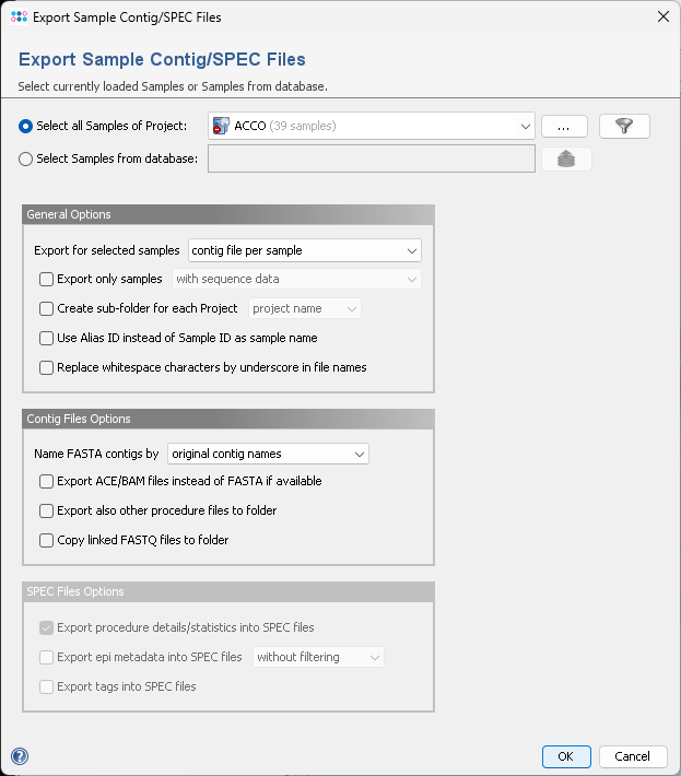 Export Sample Contig and SPEC Files dialog