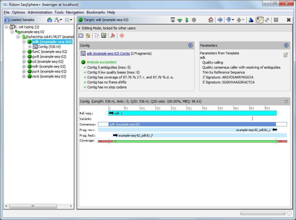 The upper right panel shows the parameters that were used for the selected target. (For Sanger sequencing data some parameters can be overwritten for this specific target by using the button Overwriter template parameters.)