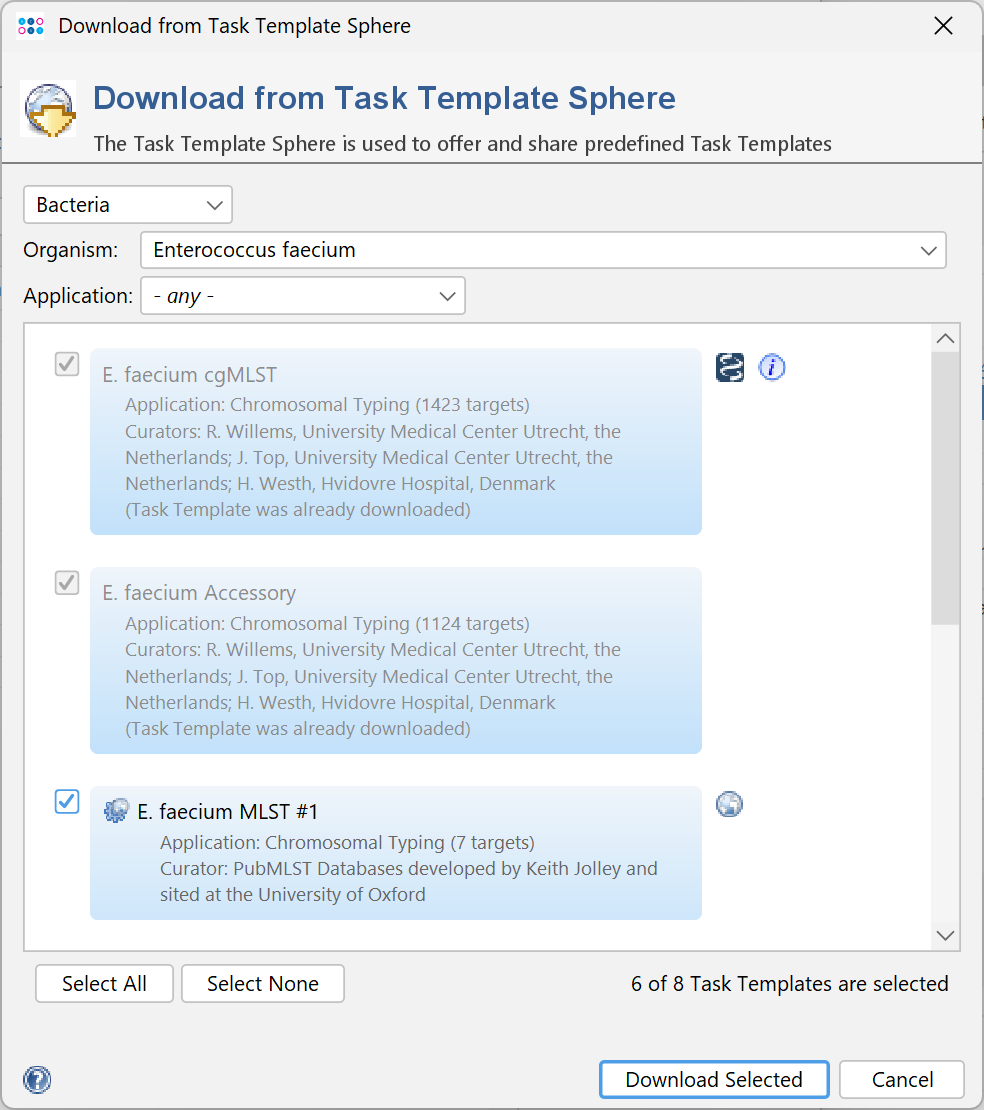 The Task Template Sphere is used in Ridom Typer to download predefined task templates. It provides predefined task templates, e.g., for The Task Template Sphere can be opened by the Download button in the The Task Template Sphere download dialog allows to select an Organism to browse all available task templates for this species. The field Application allows to show only task template with the selected application (e.g., 'Typing'). The cgMLST, Accessory and MLST task templates are preselected by default. When the dialog is confirmed with the OK button, the selected task templates are downloaded, and if invoked from a project editor dialog, they will be added to the project. After the task templates are downloaded, they are locally available in the database and can be used for multiple projects and by multiple users. Task templates will always be downloaded only once. If a task template, that was already downloaded before, is selected in the download dialog, the local copy will be used automatically. The 'NCBI AMRFinderPlus' task template is only available for download on Linux or on Windows with installed Windows Subsystem for Linux client systems. |