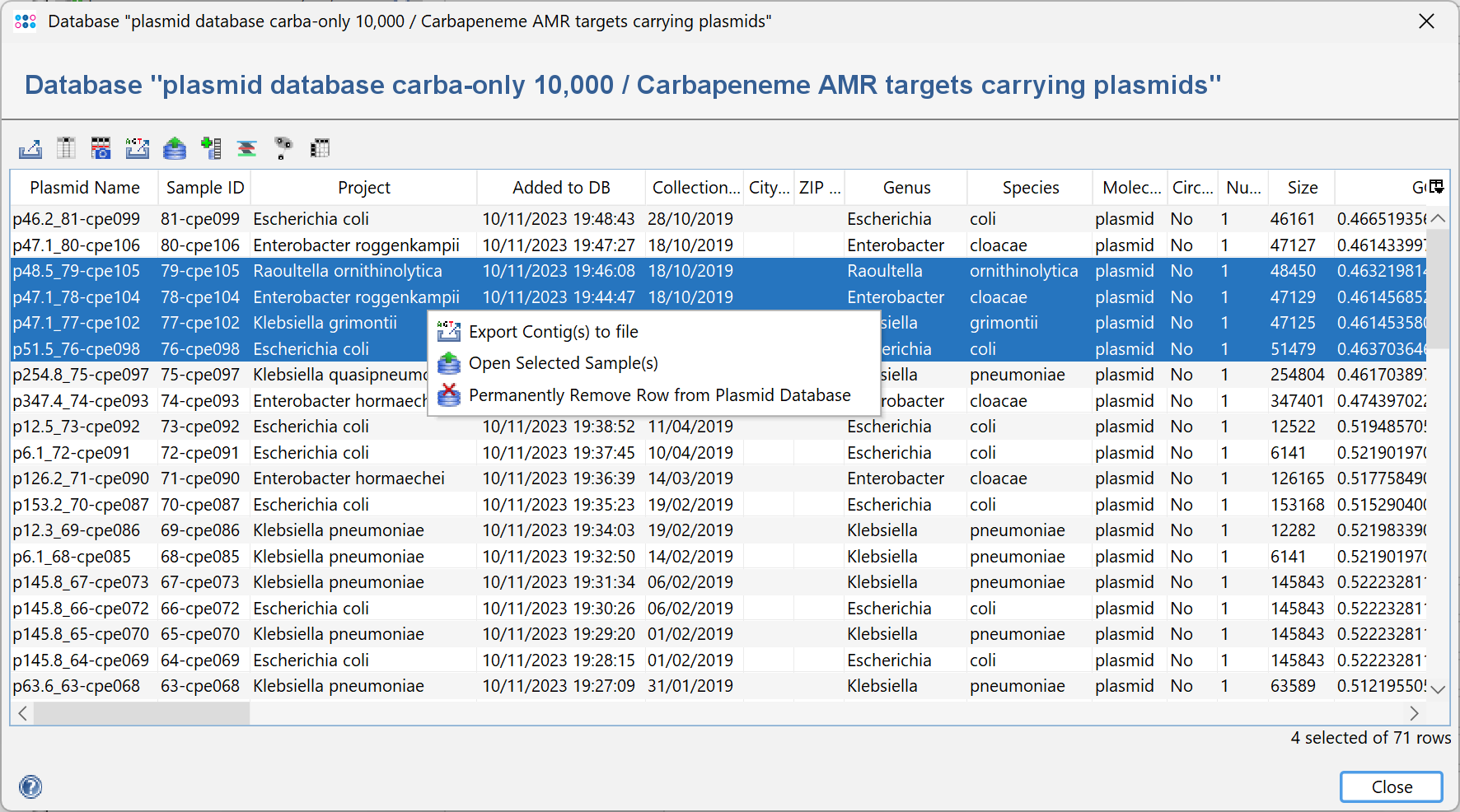 Note that it might take some moments to load the Sample data and MOB-Suite results for the Samples. Some functions are only available after this data was fetched. Plasmids are not automatically removed from a plasmid database if a sample or a task entry containing the plasmid is deleted from the Ridom Typer server database. Therefore, there can be entries in the plasmid database without a Sample ID. Selected entries can be permanently removed from the Mash database using the context menu command |