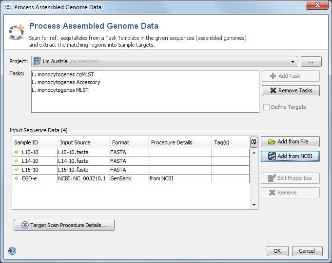 Choose Input WGS DataUse the menu function A Project and at least one Task Template must be selected. If a single Task Template is selected, the process can be limited to specific targets using the Define Targets checkbox. In the Input Sequence Data section the files with whole genome sequence data can be selected. It is possible to either