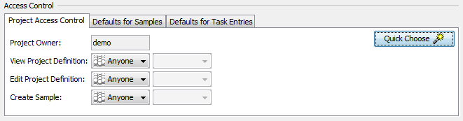 This describes, who may add new Samples to this Project. Default access settings can changed for new Samples and for new Task Entries within a Project using the Defaults for Sample and Defaults for Task Entries tabs. Use the Quick Choose button to set the whole project access rights to anyone, to group only, or to user only. ExamplesA Project is set to: View Project Definition: Anyone Edit Project Definition: Owner Create Sample: Group Berlin Edit Sample: Sample Owner Create Task Entry: Group Berlin, Edit Task Entry: Task Entry Owner Anyone will see this Project in the database search, and find its existing Samples. The Project definition itself (i.e. for adding or removing Task Templates) may only be edited by the owner of the Project. New Samples can be created by every user that is member of the group "Berlin". However, the database field values on the Sample Overview can only be edited by the user who created it. But every user of the group "Berlin" may add an new Task Entry (that is defined in the Project). |