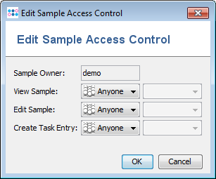 The owner of an entity is always the user which created it. If the restriction is set to "owner", than only the owner of the entity may view/edit the entity. If "group" is set as restriction, than a specific group must be chosen which members may view/edit the entity. If an entity is not viewable for a user, it won't appear in the managing dialogs. Sample Access ControlThe access control for a Sample has a third category: