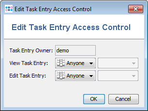 This describes, who may add new Task Entries to this Sample. If a new Task Entry is added to the server, it gets its own access control and owner, defined by the user who adds it. Therefore a Sample may contain Task Entries of different users. Project Access ControlThe access control for a Project has the third category: