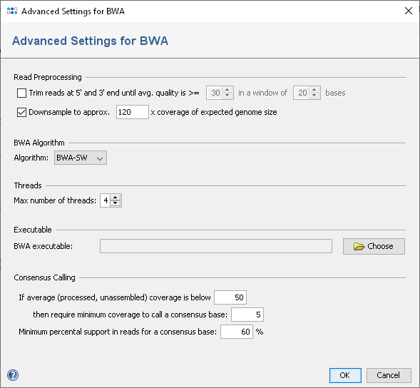 BWA is a reference genome assisted assembler for read data. It maps reads to a given reference genomes. BWA contains several algorithms, SeqSphere+ supports BWA-SW and BWA-MEM. The BWA-MEM algorithm is recommended as it is much faster than BWA-SW. However, BWA-MEM is only available for Linux, so in SeqSphere+ it is only supported on Linux and on Windows 10 with WSL installed. On Windows without WSL only the older BWA-SW is supported. BWA is used as part of the SeqSphere+ Assembling Pipeline for remapping reads to de novo assemblies (SKESA/SPAdes) or to perform reference mapping. Reference mapping is only recommended for monomorphic organisms (e.g. M. tuberculosis) as results strongly depend on the similarity of the test draft-genome to the reference. Therefore a warning is shown, if BWA reference mapping is selected in a pipeline for non-monomorphic organisms with public cgMLST schemes. BWA can also be directly accessed using the menu Tools | Read Mapper (BWA). The reference mapper opens FASTQ-files that contain either single or paired reads. The input files can be quality trimmed and downsampled before mapping. The mapped reads and the reference sequence are stored in a BAM-file. ContentsQuality TrimmingThe reads can be processed before they are mapped. They can be automatically trimmed based on read quality and downsampled. BWA does its own trimming, so quality trimming is disabled by default. When trimming is enabled, reads are trimmed on both ends until the average base quality is better than the given value in a window of a selected number of bases. DownsamplingTo reduce the size of the output files and the time required for mapping, the input files can be downsampled. Downsampling randomly removes reads so that the given approx. size is obtained. If quality trimming is selected, downsampling is done on the trimmed reads. Depending on sequencing technology and read length a different downsampling coverage setting might be useful. For Illumina HiSeq/MiSeq data a downsampling to approx. 120 times the expected genome size worked well. Standard Settings (in pipeline and manual mode)