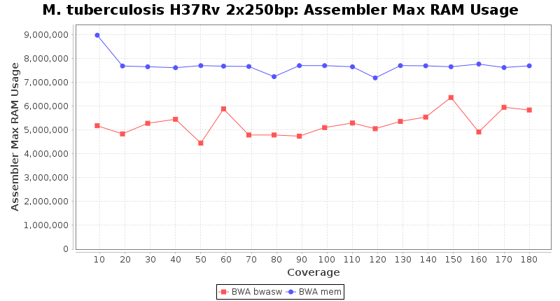 PostprocessingBefore a BAM file can be scanned by SeqSphere+, a consensus sequence is automatically calculated by the built in consensus caller. As BWA is known to create inacurrate mappings for low coverage data, the consensus calling procedure is configured to use a threshold of 5 as minimum coverage to call a non-ambiguous base, if the estimated average coverage (unmapped) is below 50. The required read support for a consensus base is 60%. Speed and MemoryThe following charts show the runtime and memory usage for mapping Illumina MiSeq 2x250bp sequence data of Mycobacterium tuberculosis strain H37Rv (NC_000962; 4.4 MBases genome) on an Intel Xeon system with 20 cores and 192 GB memory. Before reference mapping the read files were downsampled to different estimated coverages. The reference mapping was then performed with the two different BWA algorithms BWA-SW (red) and BWA-MEM (blue). In summary, reference mapping does not require huge amounts of memory and is overall much faster than de novo assembly. Versions and Open Source NoteOnly BWA version 0.6 is natively available for Windows, but the BWA-MEM algorithm is only supported since version 0.7. Therefore, SeqSphere+ includes two different versions of BWA: Version 0.6 is used for BWA-SW (on Linux and on any Windows), and version 0.7 is used for BWA-MEM (on Linux and on Windows 10 with WSL installed). The BWA reference mapping function is a wrapper to an external BWA executable. This BWA executable is open source software that is licensed under the GNU General Public License version 3.0 (GPLv3, http://bio-bwa.sourceforge.net/). The native Windows version of BWA is from https://github.com/xied75/bwa. For more information on BWA, see: Li H. and Durbin R. (2010) Fast and accurate long-read alignment with Burrows-Wheeler Transform. Bioinformatics, 26: 589-95 [PubMed 20080505] and Li H. (2013) Aligning sequence reads, clone sequences and assembly contigs with BWA-MEM. arXiv. arXiv:1303.3997 [q-bio.GN] [arXiv]. |