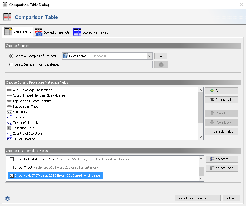 - This tab panel can be used to create and open a new comparison table with Samples from a whole Project, a selection of Samples from database (e.g., from multiple Projects or by using other advanced search criteria), or from Samples that are currently loaded. In addition Epi and Procedure Metadata Fields and Task Template Fields that should be included in a Comparison Table can be chosen here. When the newly created comparison table is opened, it retrieves the Sample data from the database. If not stored as a snapshot the comparison table is not permanently preserved.