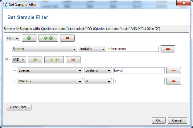 Set Sample Filter: Opens a window to select a filter. Only Samples that match the filter criteria (e.g., coverage, etc.) are displayed in the table and used in distance calculations. Clear filter to reconstitute all Samples again