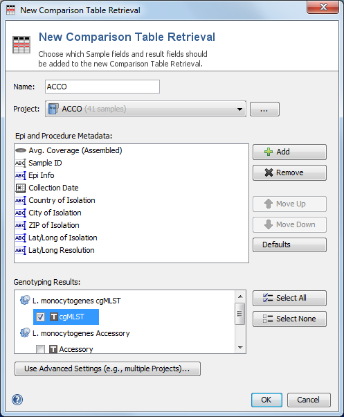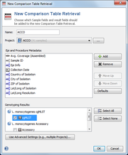 To specify Sample search criteria, to select Samples from multiple projects, or to select only part of all project Samples for a retrieval, the button Use Advanced Settings can be pressed to open a more complex search dialog. This dialog is also opened if a stored Comparison Table Retrieval is later edited via the Manage Retrieval button. This dialog allows to edit all details of a Comparison Table Retrieval: