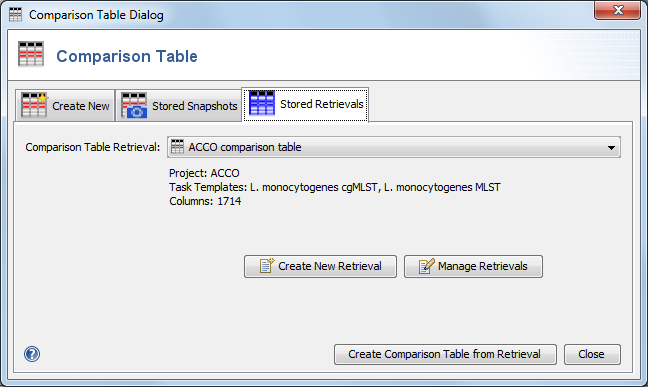 'Stored Retrievals' in Comparison Table dialog