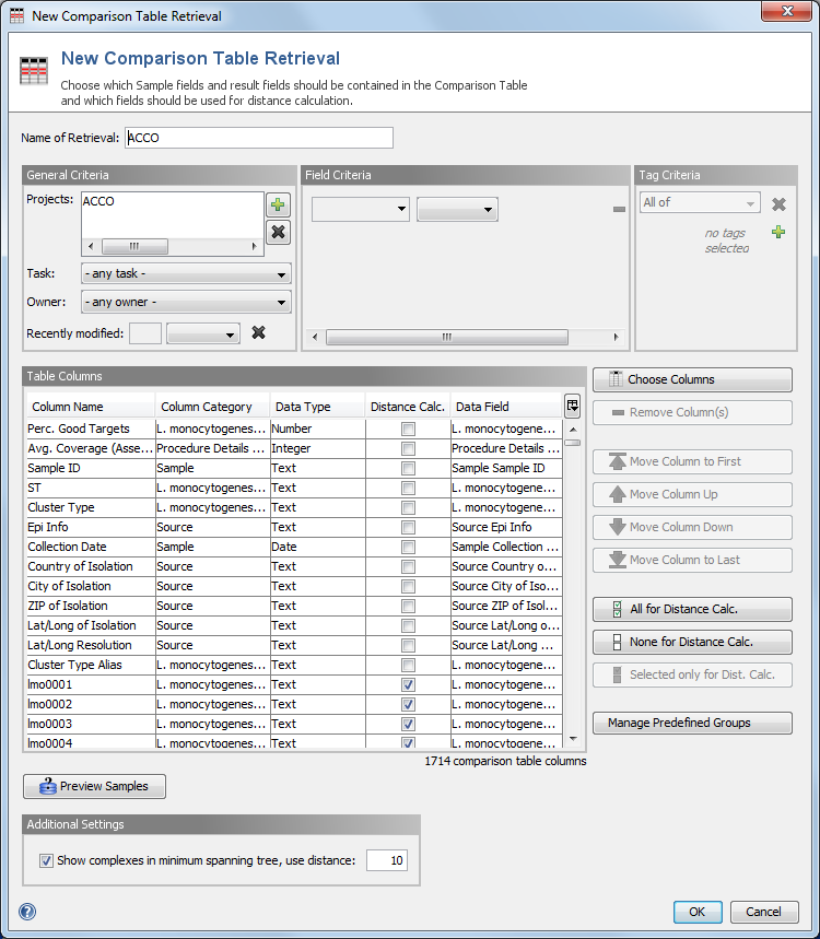 - The General, Field and Tag Criteria sections allow to define exactly which Samples should be searched and included into the Comparison Table