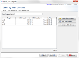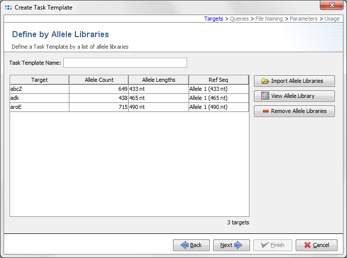 This wizard workflow can be used to define a Task Template for one target or multiple targets using allele libraries in FASTA format. Only nucleotide sequences can be used. This wizard is useful to add MLST schemes that are not available by Create from a predefined MLST scheme or to add sequences for single locus typing (SLST). One target is created for each allele library. An Allele Typing query library using the given alleles is added to the created Task Template. Note that this query library cannot be expanded by new query results. Dynamic reference sequenceAfter importing allele libraries, it is possible to select which kind of Reference Sequence should be used: