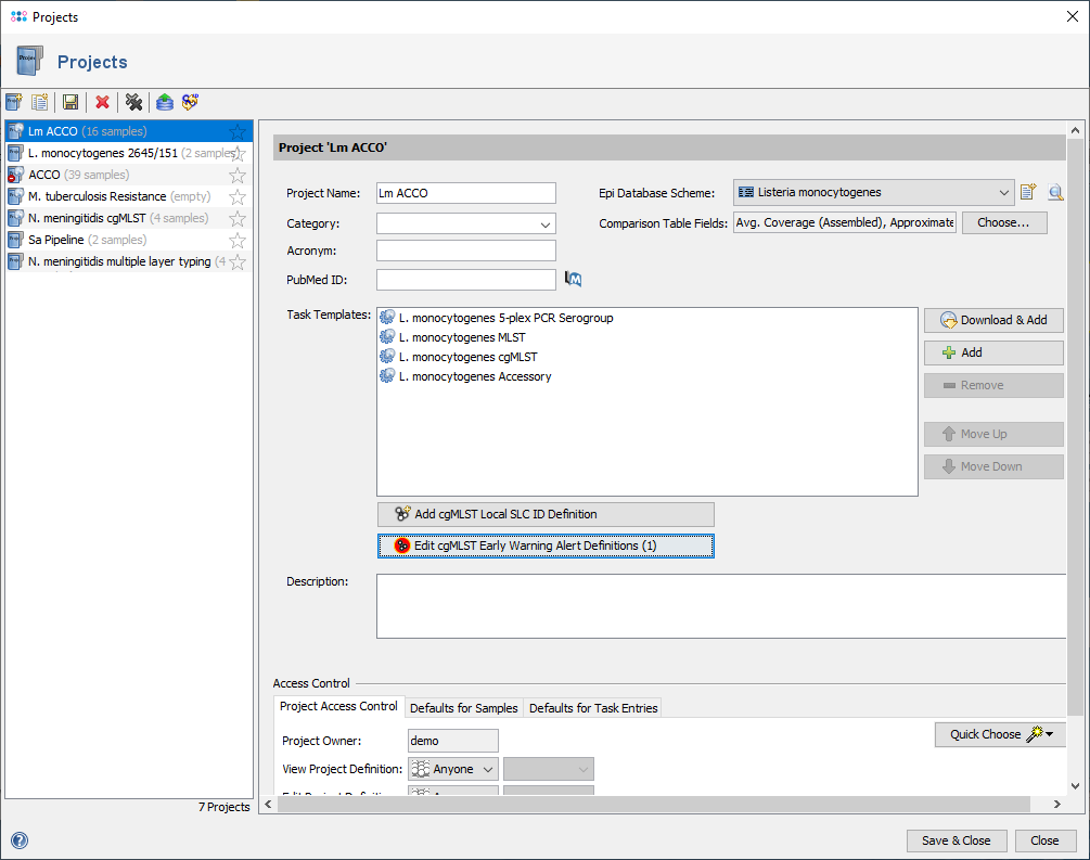 The cgMLST Early Warning Alert definitions can be created and managed by pressing the button Add cgMLST Early Warning Alert Definition in the project editor below the task templates section.