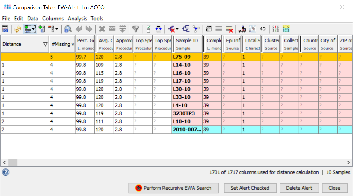 Hint: If it is intended to increase the discriminatory power for the involved samples of an EWA cluster, the accessory genome targets could be added for distance calculation in the comparison table. Issue the command Columns | Select Genotyping Scheme for Distance Calculation ... and select in the upcoming dialog the Accessory Task Template in addition to the cgMLST Task Template.