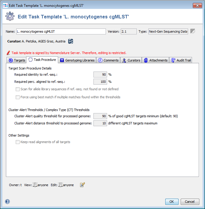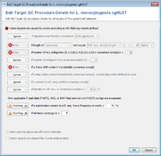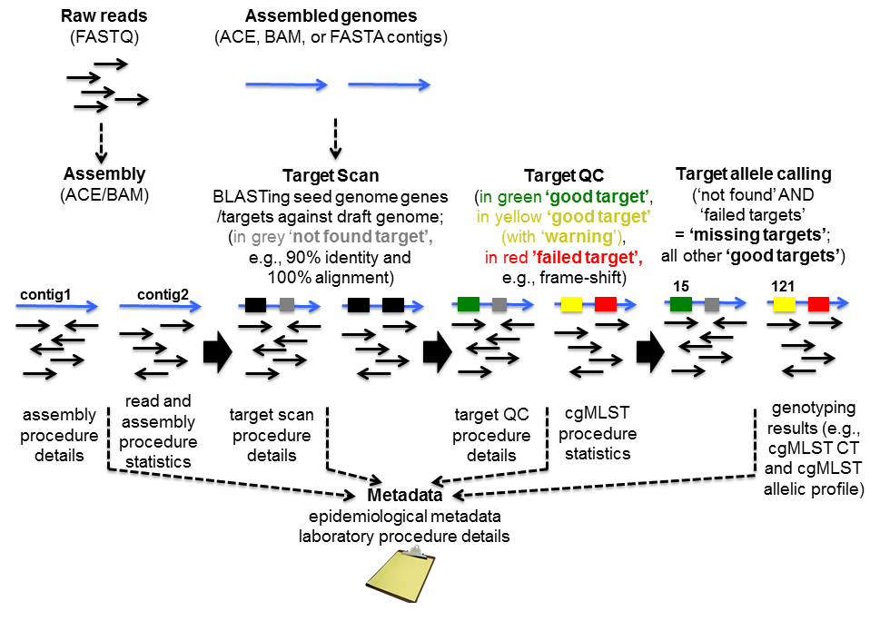 ContentsOverviewAssembly and consensus sequence callingAssembling with VelvetFor de novo assembly done with the MS Windows SeqSphere+ Client the FASTQ files are first quality-trimmed (default setting for trimming is to trim on both ends of the reads until the average base quality is >30 in a window of 20 bases), downsampled (for Illumina downsampling to approximately 120x coverage of the expected genome size is default) and then de novo assembled using the Velvet assembler (version 1.1.04) with k-mer optimization procedure (optimum criteria is average length of contigs with more than 1000 bp). The AMOS file that is created by Velvet is automatically converted to ACE file format containing all mapped reads. The consensus bases are newly assigned by a SeqSphere+ consensus caller and stored in the ACE file. Most notable the consensus caller calls a ‘N’ for a position if a base is not supported by 60% or more of the reads at this position. Assembling with SKESAFor de novo assembly done with the Linux version of SeqSphere+ Client (version 8.3) or with the Windows version on Windows 10 with installed WSL the SKESA assembler (version 2.4.0) can be used. Here quality-trimming of reads is in contrast to downsampling not done by SeqSphere+ by default. SKESA is run with recommended default parameters. By default, a polishing step is performed after assembling: reads are mapped back to the resulting FASTA contig file and an additional SeqSphere+ consensus calling is done. Assembling with SPAdesFor de novo assembly done with the Linux version of SeqSphere+ Client (version 8.3) the SPAdes assembler (version 3.11.1) can be used. Here quality-trimming of reads is in contrast to downsampling not done by SeqSphere+ by default. SPAdes is run with recommended default parameters (slightly different for various sequencing platforms). By default, a polishing step is performed after assembling: reads are mapped back to the resulting FASTA contig file and an additional SeqSphere+ consensus calling is done. Mapping with BWACurrently reference-assisted assembly (‘mapping’) is only applied for Mycobacterium tuberculosis cgMLST. Here the BWA-SW algorithm (version 0.6.1/0.6.2 for Windows and Linux respectively) or BWA-MEM (version 0.7) is used. SeqSphere+ quality-trimming of reads is disabled by default. Reads are downsampled to approximately 120x coverage of the expected genome size before performing the BWA-SW mapping with default parameters. The above described SeqSphere+ consensus caller reads the resulting BAM file and calls a consensus sequence by applying the same majority rule as above. If the reference genome has regions that are uncovered in the genome under study, those gaps are deleted in the resulting consensus sequence and juxtapositional covered regions are concatenated. This procedure applies also for FASTA consensus files from mappings that are exported from SeqSphere+. Target scan, quality control, and allele callingFinding, evaluating, and allele calling the core and accessory genome genes (targets) defined in the schemes is for each target separately a three-step procedure, i.e. first ‘BLASTing’ and aligning, second applying some quality criteria for the found hit, and finally assigning a known or new allele type integer. The input genome file format may be ACE, BAM, GenBank, or FASTA. Target scanA BLASTN (BLAST version 2.2.12 or BLAST+ version 2.9.0+ if seed genome >= 6 Mbases) similarity search (word size: 11, mismatch penalty: -1, match reward: 1, gap open costs: 5, and gap extension costs: 2) is performed using the scheme’s target sequences of the seed genome (ref.-seqs.) as query sequences and the to be compared genome contig(s) as subject sequence(s). For each target a separate BLAST hit list is produced. To speed up the ‘blasting’ all contigs shorter than 200 bases are ignored as subject sequences by default. All BLAST hits with an alignment that ends near the start and/or end of a query sequence (less than 16 bases) are extended. Thereby the missing bases at the start and/or end are extracted from the query and the subject sequence, and are aligned separately using a global alignment with affine gap score (gap open costs: 4 and gap extension costs: 3). The resulting alignment(s) are then concatenated to the original alignment of the BLAST hit. Next the percentages of identity and alignment to the ref.-seq. are calculated for all extended and the other not-extended BLAST hits. All hits that pass the configurable thresholds (90% identity and 100% alignment by default for SeqSphere+ cgMLST schemes; Fig. 2) are marked as top-matching hits. The required identity threshold is somewhat species-specific (e.g., for the SeqSphere+ C. difficile cgMLST scheme only 80% identity is required). If only one top-matching hit is found this hit is selected for further processing. If multiple top-matching hits are found then no hit is selected to avoid ambiguous results (it is tried to eliminate those targets already during the scheme definition process). If no hit is selected for a target it is called in the software a ‘not found target’. The subject sequences of all selected top-matching hits are extended by 10 bases at each end. Those sequences are next aligned to each corresponding target ref.-seq. using a heuristic alignment that first applies BLASTN to find the longest overlapping region and then uses banded alignments to align the sequences left and right of the hit (bandwidth: 100, gap opening penalty: 6, and gap extension penalty: 3). Those determined overlap with the ref.-seq. defines the target sequence. Optionally it can be configured that all known allele sequences for each target are searched, if no selected hit was found for a target in the ref.-seq. blasting step (or if no ref.-seq. is configured for a target in the scheme). In this case all known alleles for each target are used as query sequences instead of the target sequences of the seed genome only (option not applied