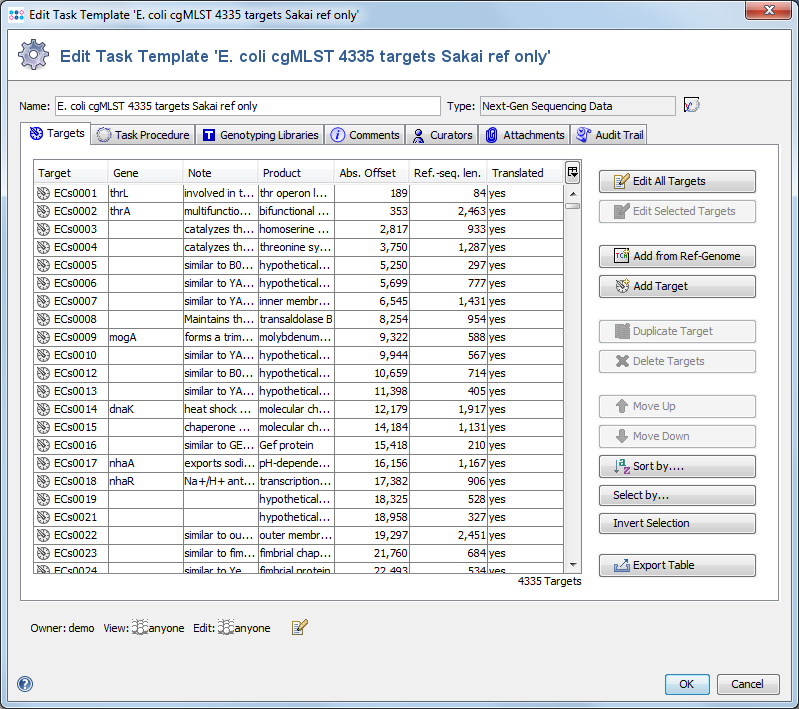 The first tab in the Task Template editor shows a table with all targets that are defined in this Task Template.