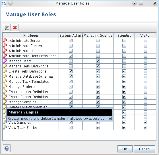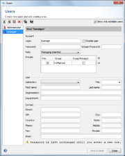 The system administrator can also define new roles using the menu item User GroupsEach user belongs to one or more groups. Groups are used to arrange user accounts according to different rights (view, edit) for data objects in several Projects. If users belongs to more than one group a primary group must be chosen. The primary group may be used in access control definitions. A user with the associated role Managing Scientist may be the manager of a group and may therefore create new users in this group. Creating a New UserYou need to have the user role Managing Scientist or System Admin to create new users! Use the menu function The left button in the tool bar ( Minimally a login name, a password, and the role for the new user must be entered/selected. Furthermore, the first and last name of the new user should be entered. As managing scientist you can only create users with the associated roles scientist, analyst, or visitor. Group memberships of a new user cannot be changed by them; the new user is automatically a member of the same groups as the managing scientist. Disabling a UserCheck the Disable User box to disable a user. The disabled user is not allowed to login on the server anymore. If a user is disabled, it is automatically removed from the number of named users that are allowed by the license. Users with the role System Admin cannot be disabled, until the role is changed. Deleting a UserUse the |