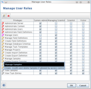 ContentsUser AccountsEach person who is working with Ridom SeqSphere+ should have an own account on the server. A login name and a password is required to connect and login to the server. Each administrator has the right to create new user accounts. User RolesEach user has an associated role in the system. For each role certain rights are defined, like creating users, creating projects, or creating samples. The predefined roles are: