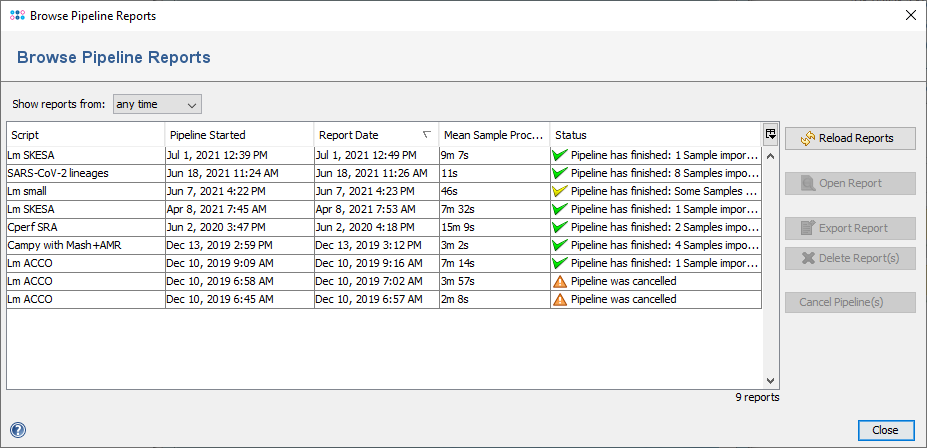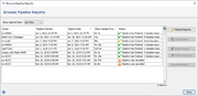 A table of all visible pipeline reports is shown. Pipeline reports are periodically delivered by the pipeline, therefore you may also see reports of running pipelines in this table.