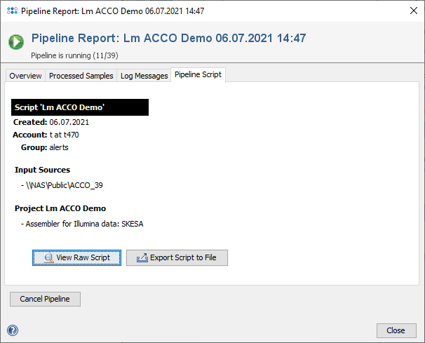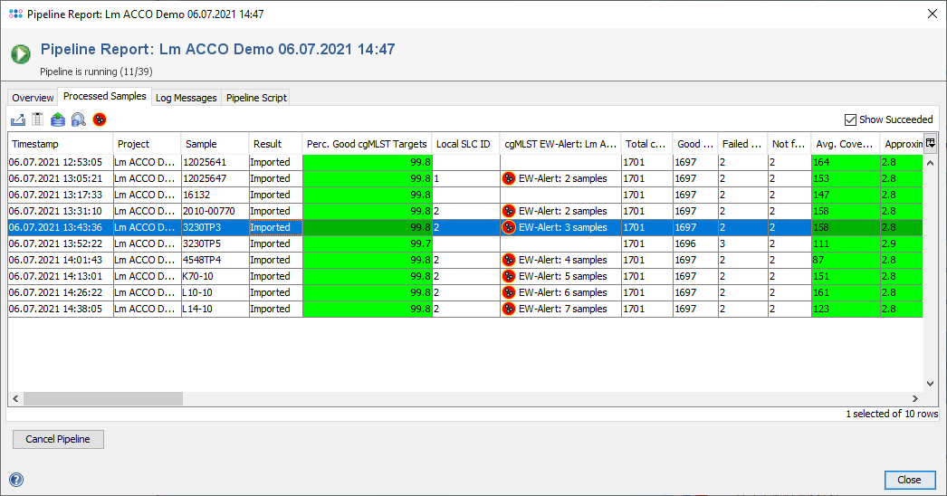 Use the Double-click or use the The Cancel button can be used to send a stop signal to a running pipeline. Pipeline Report ChaptersOverviewShows a summary of the pipeline results. If Early Warning Alerts (EWA) are defined in the project and an EW-Alert has been triggered for samples processed by the pipeline, an EWA icon and warning is shown in the bottom of the overview.