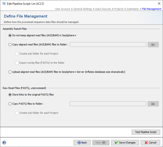 In this last section it can be defined how the pipeline process should manage the assembled/mapped files (ACE/BAM) and the read files (FASTQ). All files are referenced in the process tab of a Sample (see more details).