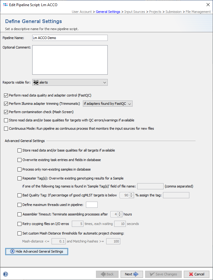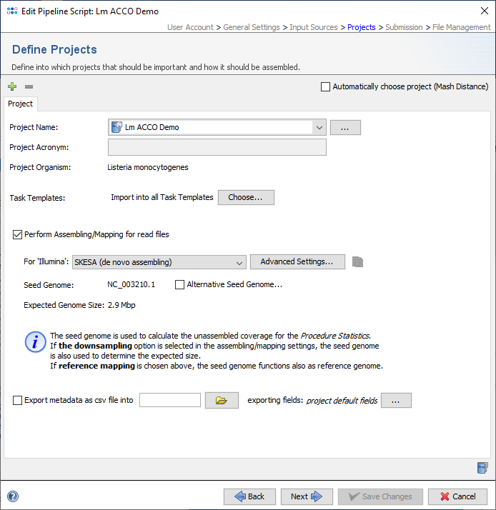 If the checkbox Automatically choose project (Mash Distance) is selected, the pipeline uses Mash Distance to choose the project for a Sample out of the list of projects defined in the pipeline script. Therefore, only one project per species can be defined in the pipeline if this option is used. The option is disabled if project acronyms are used.
