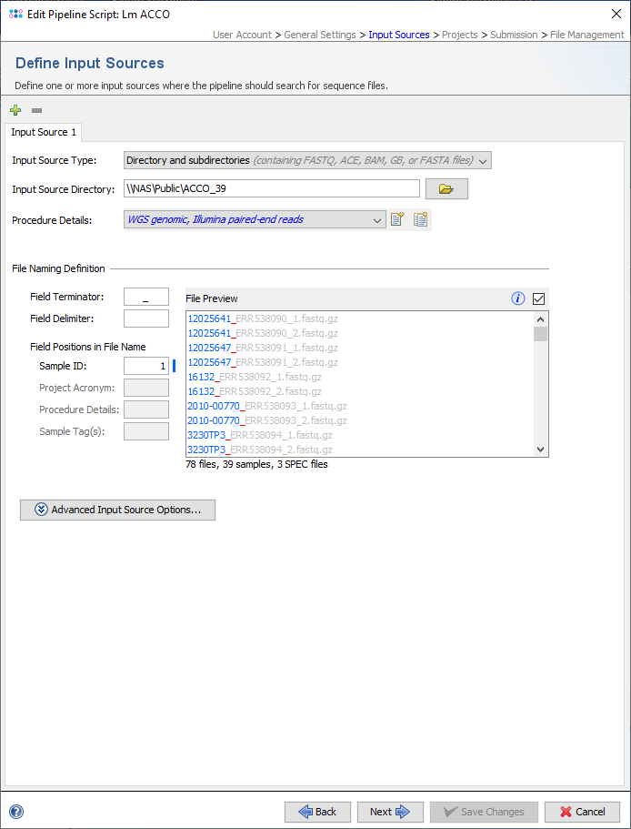An input source defines where the pipeline should look for sequencing data (FASTQ/ACE/BAM/GB/FASTA files). FASTQ files with adapters (& multiplex indices) trimmed-off are required here for optimal de novo assembly results. Multiple input sources can be defined to process different samples from different directories and sequencing machine vendors (e.g., Illumina or Ion Torrent) by pushing the + Add button in the upper-left corner.