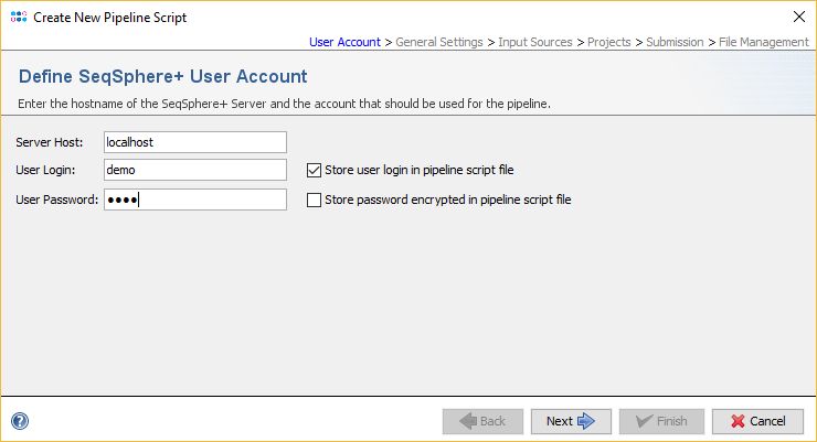 To setup a pipeline script a user account on a specific server is required. By default, the User Login but not the User Password will be stored in a pipeline script. Thereby the script can only be edited and run when the Password of this user is entered. This means the pipeline will be run on behalf of this user, and all Samples created by such a defined pipeline script will be owned by this user.